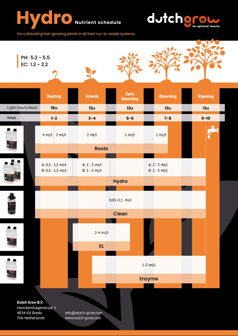 The DutchGrow Hydro feeding schedule offers a complete range of products for fast-growing plants in hydroponics. DutchGrow Roots stimulates strong roots and enhances plant resistance, while DutchGrow Hydro is specially designed for growth and flowering stages, ensuring optimal results. DutchGrow Clean keeps irrigation systems clean and efficient. DutchGrow XL improves flowering and fruit quality, and DutchGrow Enzyme breaks down dead plant residues, improving the medium and nutrient uptake. Ideal for healthy, vigorous plant growth.