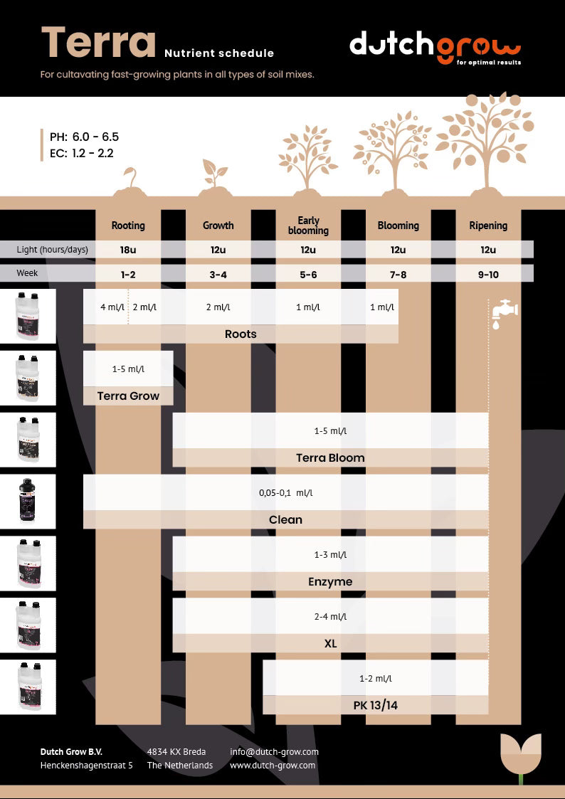 The Terra feeding schedule from DutchGrow is designed for fast-growing plants in all types of soil mixes. It starts with DutchGrow Roots for the rooting phase, followed by Terra Grow during the growth phase. Terra Bloom is used for the flowering phase. The schedule also recommends the use of Clean for a clean irrigation system, Enzyme for breaking down dead plant remains and improving the soil, and XL for boosting yield and quality during the final ripening phase.