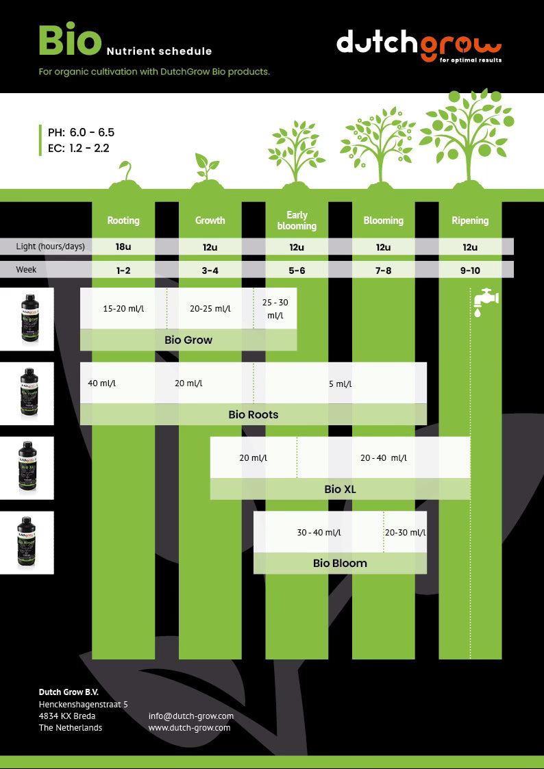 Use DutchGrow Bio Grow for the growth phase, encouraging strong plants and lush root development with organically bound nitrogen. DutchGrow Roots strengthens the plant's roots and resistance. DutchGrow Bio XL, a naturally fermented plant extract, enhances the flowering phase and increases fruit sugar content. DutchGrow Bio Bloom aids in fruit formation during the flowering phase, with less nitrogen and more phosphorus and potassium.