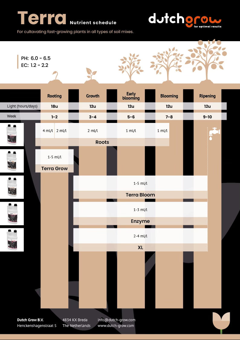 For growing fast-growing plants on all types of soil mixes, the Terra feeding schedule from DutchGrow is optimized. Start with DutchGrow Roots during the rooting phase to stimulate root growth. Switch to Terra Grow for the growth phase, followed by Terra Bloom during the flowering phase for optimal bloom and fruit development. Add Enzyme to break down dead plant remains and improve the medium. Finish with DutchGrow XL during the ripening phase to increase the yield and quality of flowering plants.