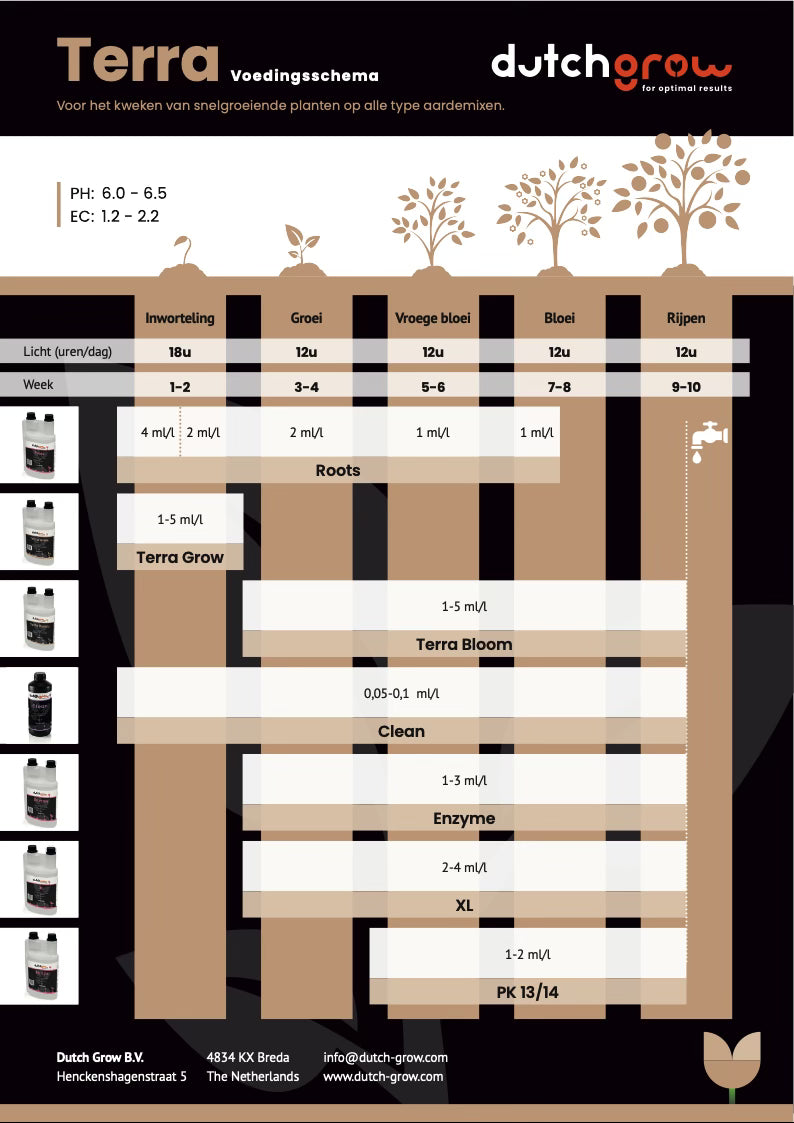 Optimaliseer plantengroei met dit DutchGrow Terra voedingsschema. Gebruik DutchGrow Roots voor een krachtige wortelontwikkeling en betere weerstand van planten. DutchGrow Terra meststoffen, speciaal voor snelgroeiende planten, stimuleren zowel groei als bloei. Houd irrigatiesystemen schoon en efficiënt met DutchGrow Clean. Verbeter grond- en bodemkwaliteit met DutchGrow Enzyme, en maximaliseer bloei en vruchtkwaliteit met DutchGrow XL en PK13/14. Deze combinatie zorgt voor een gezonde groei en overvloedige bloei van planten.